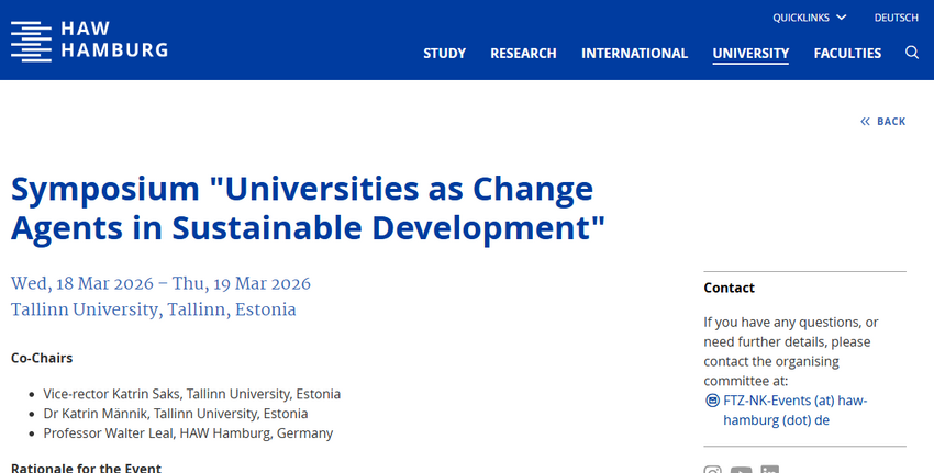 The Symposium Universities as Change Agents in Sustainable Development, which will be held in Tallinn in March 2026, is founded on the belief that the academic sector needs to move beyond siloed initiatives and theoretical discourse to become integrated, proactive, and measurable change agents. The event will provide a platform for forging new partnerships and co-creating actionable strategies that harness the full potential of universities to address the most pressing ecological, social, and economic challenges of our time.